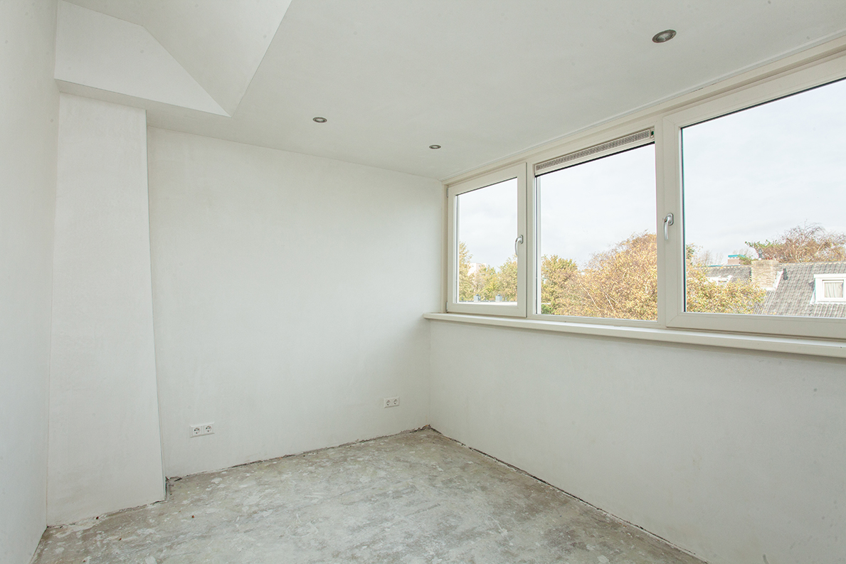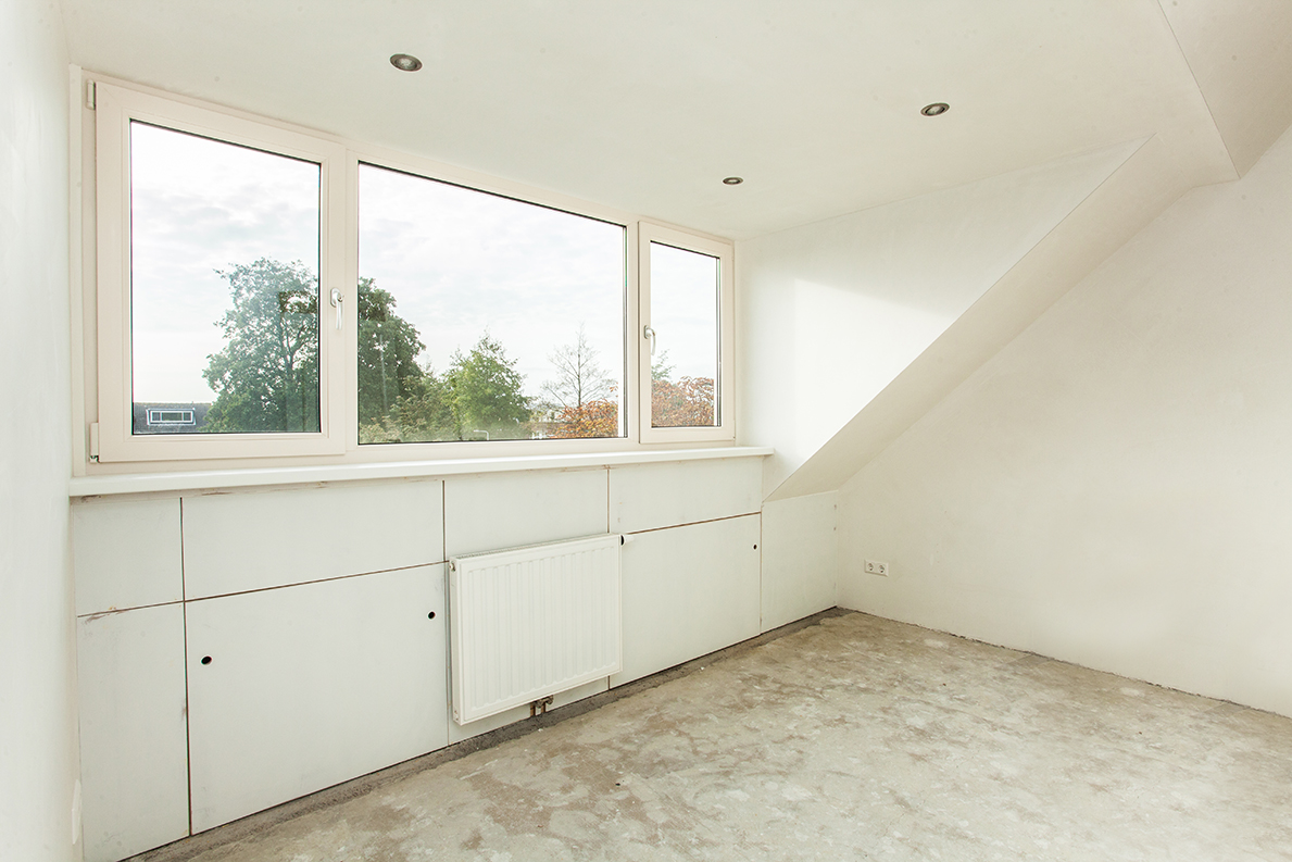 De zolderetage is volledig gestript en afgewerkt. Van het leidingwerk en elektriciteit tot aan het stuc- en schilderwerk.